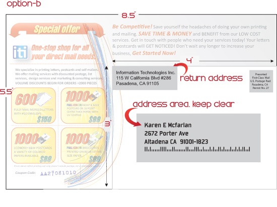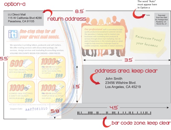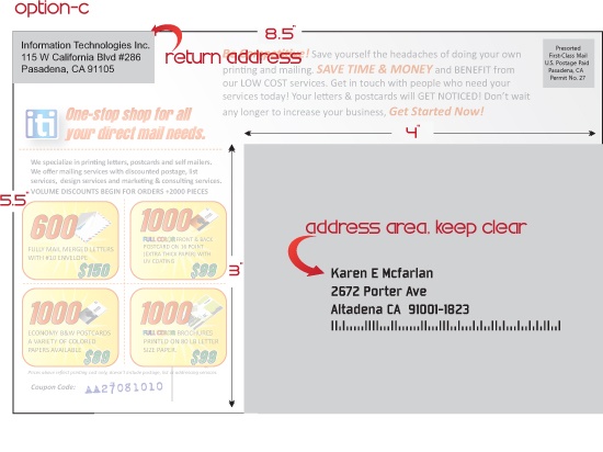 You have three choices in addressing your large postcards. Large postcards are 5x7, 5.5x8.5, 6x9, and 6x11. The shaded areas are reserved for addressing purposes, the white areas can be used as desired. The examples below are based on 8.5x5.5 postcards, but the measurements indicated for addressing remain the same if you are using one of the different size postcards listed above.