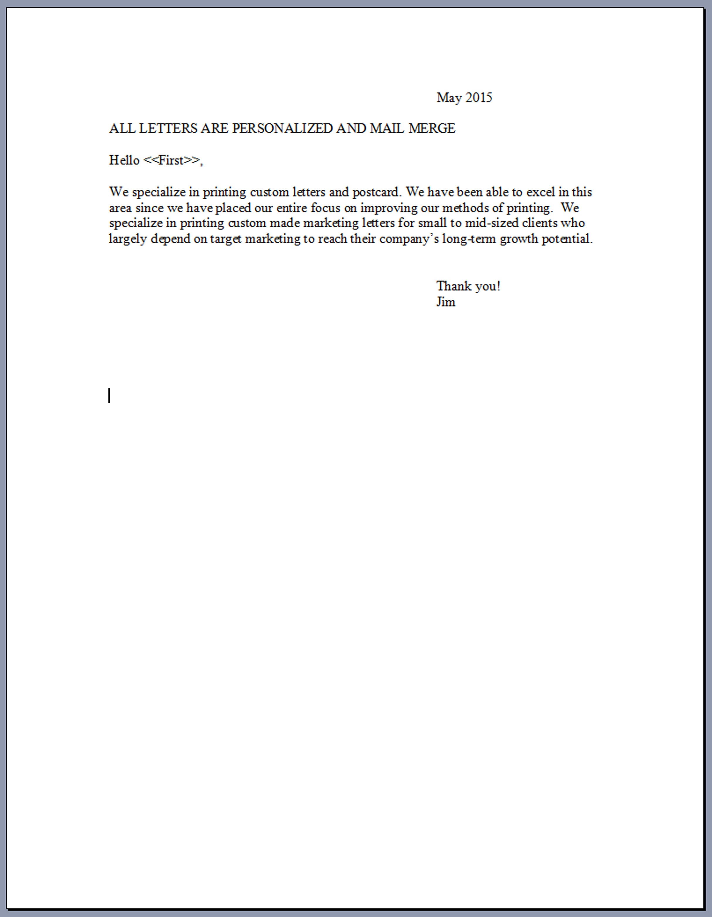 - Your text: Supply us with your letter in a PDF file. You can write your letter in Ms Word then Save As into PDF. Break up your text the way that you would want it printed. Your titles, subtitles, salutation, paragraphs, closing statements and anything else must be clearly arranged on your Word document. Your text must be in the correct order; we lay out your text in the same order as it appears in your Word document. Use the comment function in PDF to indicate any required formatting such as bolding, underlining, increased font size, different colored fonts or anything else. We do NOT break your text into separate paragraphs. We follow your paragraph structure as you have supplied to us in your PDF document. For instance, if you need the word "Buy" to appear by itself in the middle of a line with a blank line above and below it, then that is how it needs to appear on your PDF document.