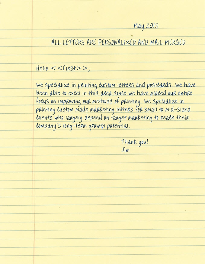 - Fonts to be used: Handwritten fonts are almost always used when printing on notepad paper. You can use any of our handwritten fonts we offer here. You are only allowed to use one type of font for your letter and one for your envelope and we highly recommend that you use the same font for both the letter and envelope. Using the same font for both the letter and envelope will enhance the look for a more natural appearance. You will specify the font number for your envelope on the price calculator, and that will be the font we'll use for your letter as well unless you comment during the checkout that you prefer a different font for your letter. Keep in mind that handwritten fonts are much larger than normal type written fonts; therefore, your letter should be no longer than 1/3 of a page in a normal 12 point font.